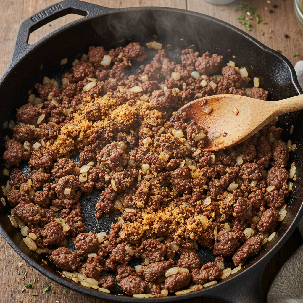 - Brown the Beef: Get a large skillet or Dutch oven over medium-high heat. Add the ground beef and break it apart with a spoon. Cook until it’s nicely browned. Don’t drain all the fat—that’s flavor! Drain just the excess if there’s a lot.