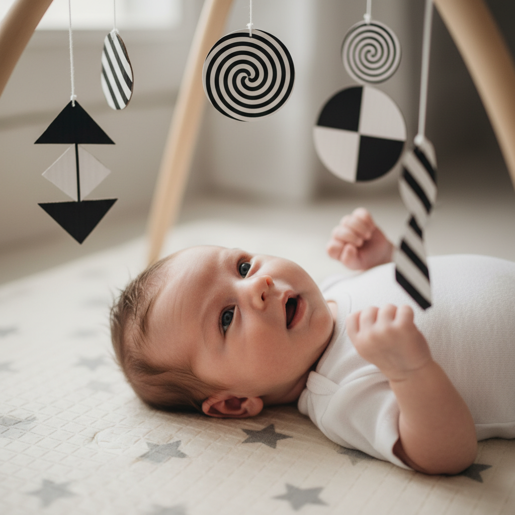 Newborns’ vision is still developing, and they are drawn to high-contrast black and white images. This mobile helps them practice focusing and tracking objects.