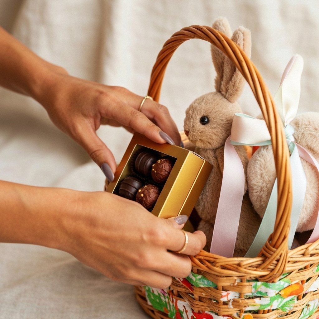 - The Golden Goddess: Gold-painted basket, a wine glass (stemless looks modern), a mini bottle of sparkling cider, gold-wrapped chocolates (like Ferrero Rocher dupes), and a glittery nail polish.