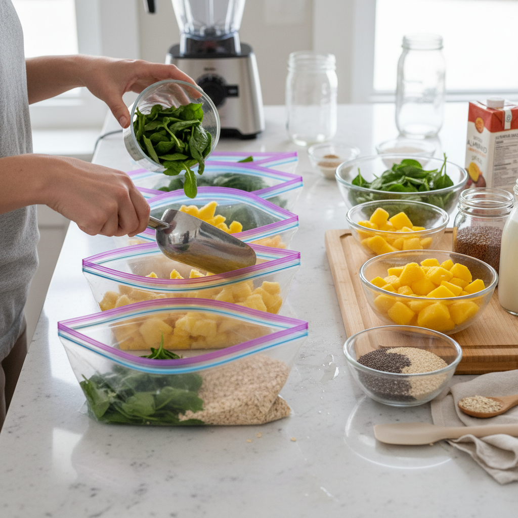 This is the ultimate meal prep hack for busy people. On Sunday, set up an assembly line. Get out a bunch of freezer-safe bags or containers. In each one, portion out all the solid ingredients for a single smoothie (e.g., frozen banana, oats, spinach, berries). Label them and toss them in the freezer. In the morning, all you have to do is dump one pack into the blender, add your liquid and your protein base (yogurt/tofu), and blend. No chopping, no measuring, no thinking required.