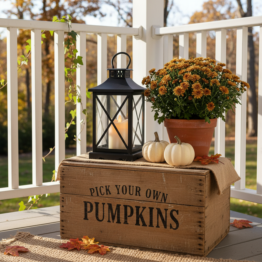 - Add Height: Place your tallest item in the back. A tall lantern (with a battery-operated candle inside) or a vase with faux seasonal branches works perfectly.