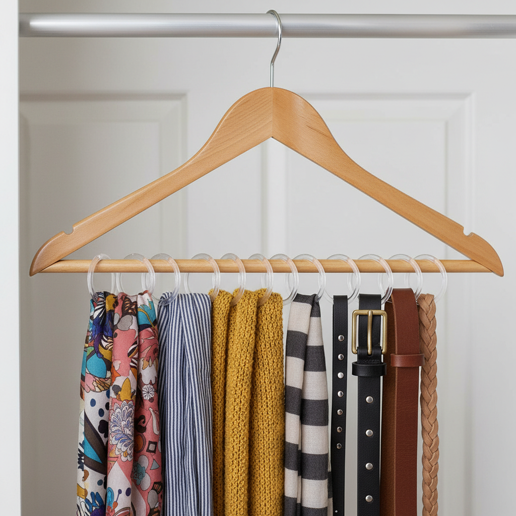 A pack of plastic shower curtain rings and a single sturdy hanger. That’s it. For about $1.25, you’re building a high-capacity accessory organizer.