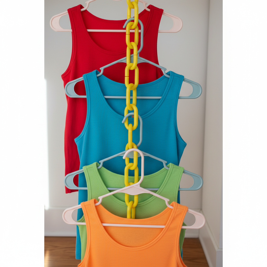 - Take your hangers with the items you want to group (e.g., tank tops) and hook them into the links of the chain, working your way down.