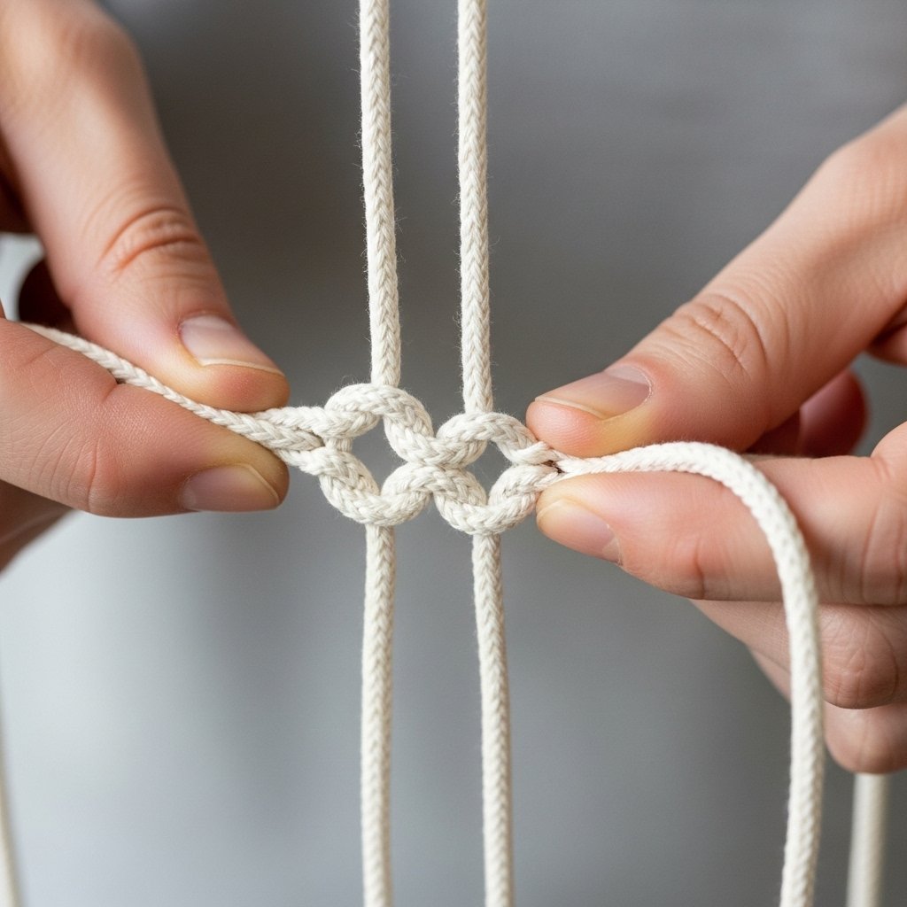Let’s form the net that will hold your pot. Move down about 4-5 inches from your last row of knots. Now, you’re going to make another row of square knots, but this time you’ll connect the sections. Take two cords from one section and two cords from the section next to it. Use these four cords to tie a new square knot. Repeat this all the way around, connecting all four sections. Drop down another 3-4 inches and repeat this process one more time to create a second row of alternating square knots. This creates the diamond pattern that forms the basket.