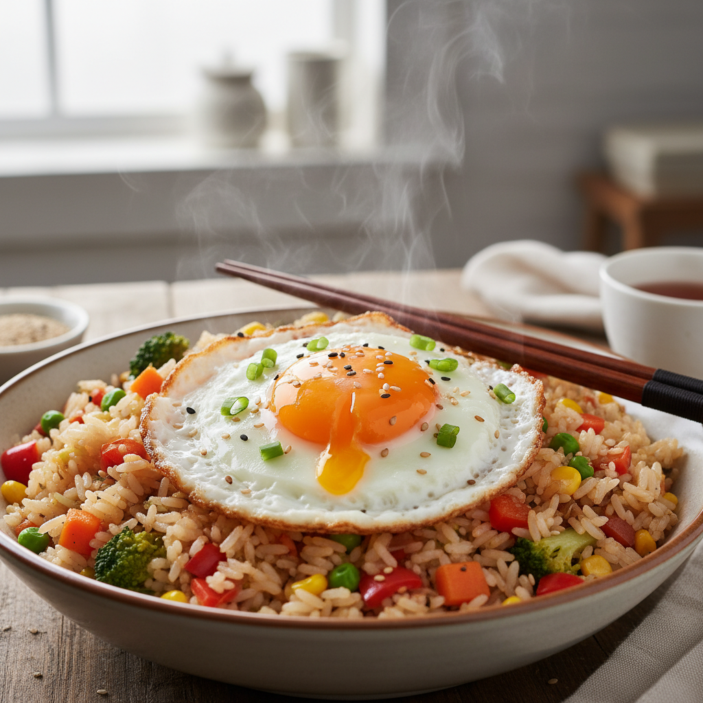 - To level up, fry a second egg sunny-side up in a separate pan. Serve the fried rice in a bowl and top it with the fried egg.