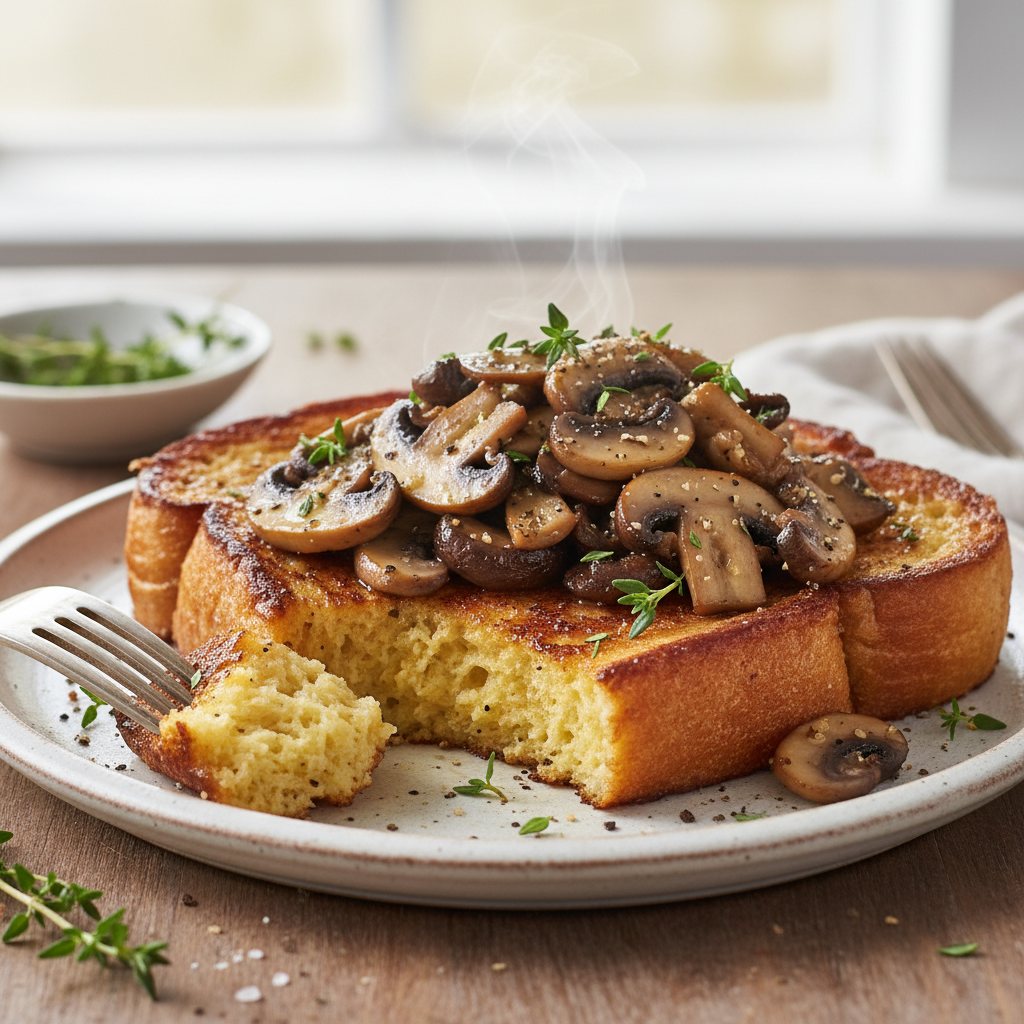 - Serve the savory French toast topped with the sautéed mushrooms. A fried egg on top is optional but highly recommended.