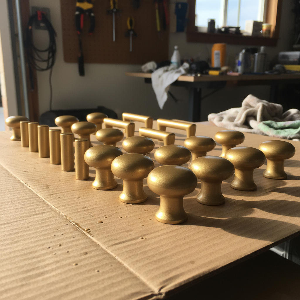 - Step 4: Set Up Your Paint Station: Head to a well-ventilated area—outdoors or a garage with the door open is ideal. Lay down your drop cloth. Take your cardboard box and poke the screws from your hardware through it from the underside, then screw your knobs and pulls onto them on the top side. They should be standing up, ready for a 360-degree paint job.
