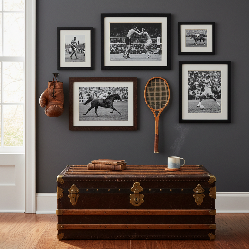 This look is a nod to classic sports and heritage style. It’s less about bright team logos and more about the materials and history of the games. Think worn leather, dark woods, vintage sporting equipment, and framed archival prints.