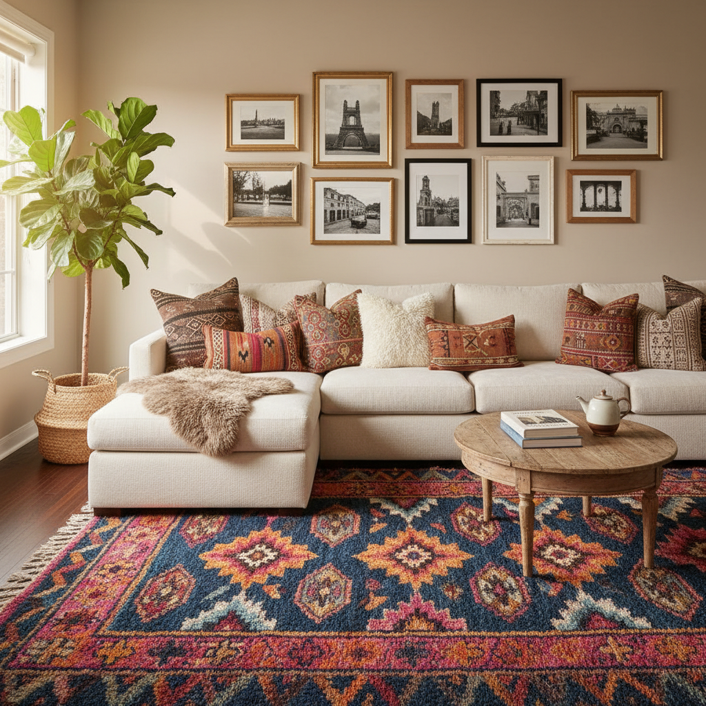 • Focus on Textiles: A single piece, like a Moroccan-style rug or a Kilim-patterned throw blanket, can define an entire room. It’s often cheaper to buy one large, impactful textile than to fill a room with lots of small, cheap decor items. Check Etsy for affordable options.