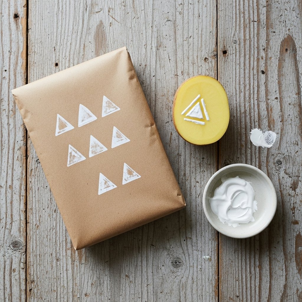 2. Get Creative: Now you have a blank canvas. This is where you can personalize it. For a ridiculously easy and chic pattern, make a potato stamp. Cut a potato in half, carve a simple shape (a star, a triangle, a heart), dip it in paint, and stamp away. Let it dry completely.