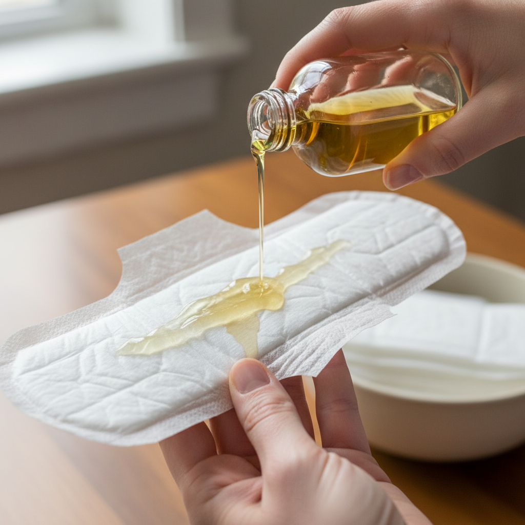 - Prep the Pad: Partially unwrap a maternity pad, but don’t detach the wrapper. Open it up like a book, leaving the pad attached to the paper backing.
