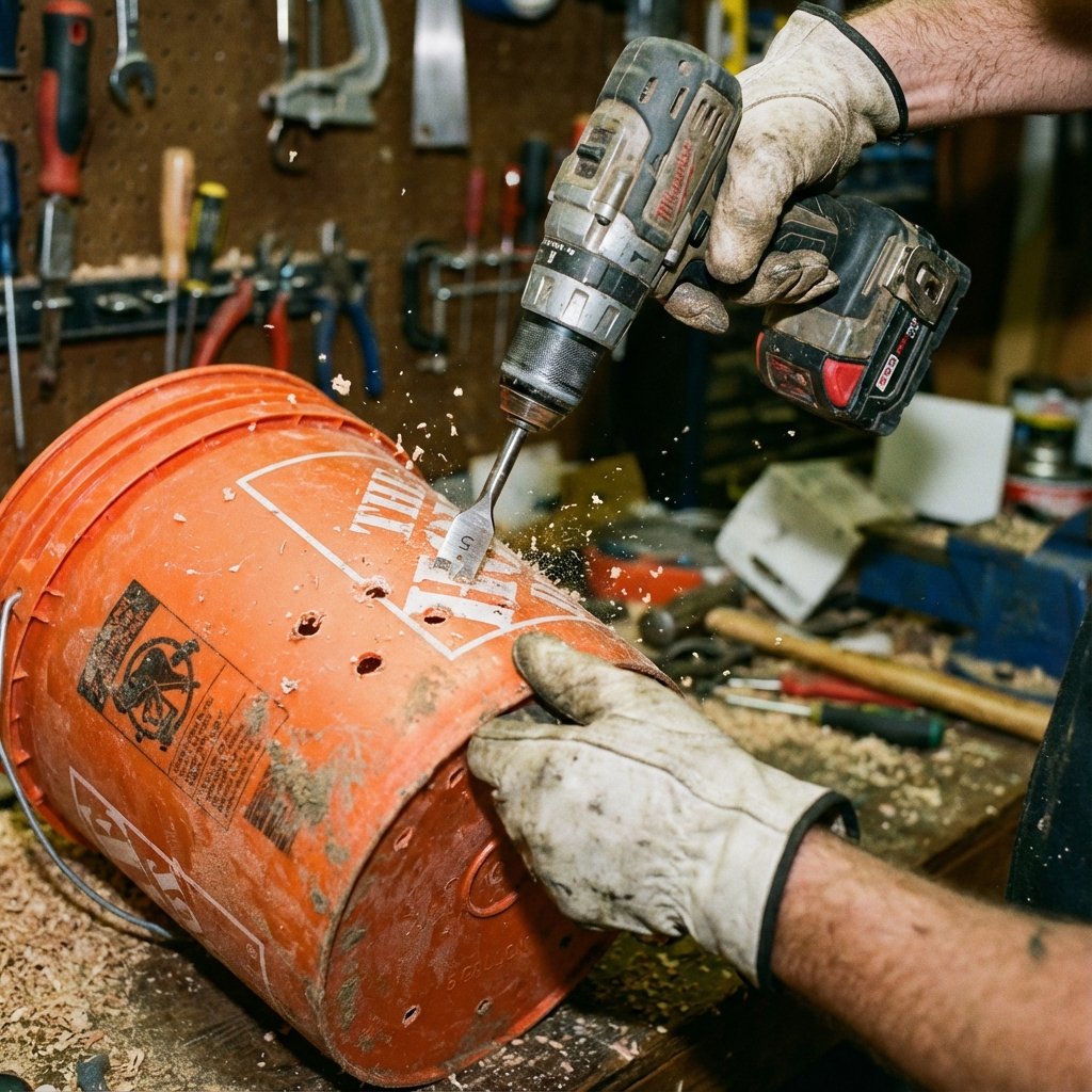- Drill the Drainage Holes: Take ONE of the buckets (this will be your inner bucket). Flip it upside down. Drill 8-10 small holes (about 1/4″ to 1/2″ in diameter) through the bottom. This is critical for drainage. If water pools at the bottom, your compost will turn into a stinky, slimy mess. We’re building a smell-free system, and it starts here.